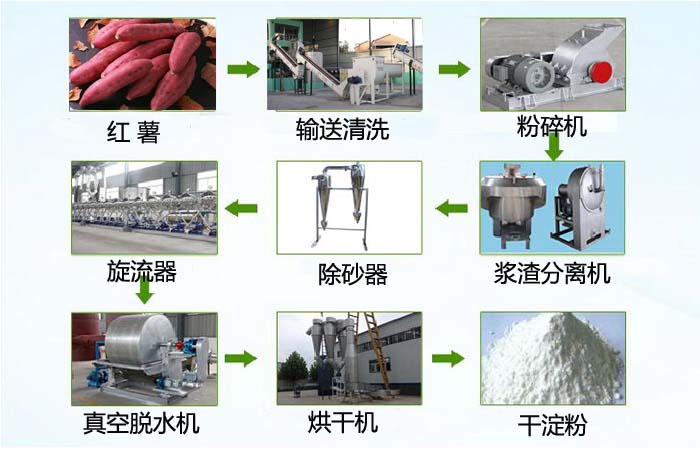 紅薯→(清洗輸送機(jī))→清洗(清洗轉(zhuǎn)籠)→粉碎(錘片式粉碎機(jī)或銼磨機(jī))→漿渣分離(壓力曲篩或離心篩、漿渣分離園篩)→除砂(除砂器)→蛋白纖維分離(碟片分離機(jī)、濃縮凈化旋流器機(jī)組)→脫水(離心機(jī)或真空脫水機(jī))→烘干(低溫低塔氣流對(duì)撞淀粉烘干機(jī))→包裝入庫(kù)。