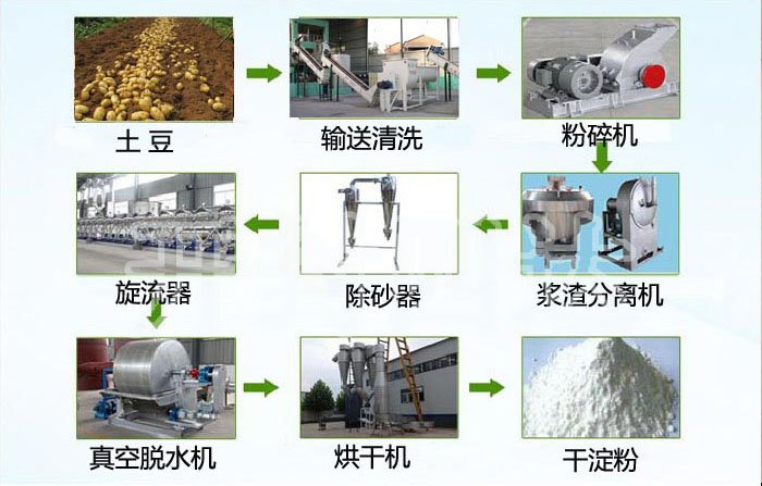 馬鈴薯→(清洗輸送機)→清洗(清洗轉籠)→粉碎(錘片式粉碎機或銼磨機)→漿渣分離(壓力曲篩或離心篩、漿渣分離園篩)→除砂(除砂器)→蛋白纖維分離(碟片分離機、濃縮凈化旋流器機組)→脫水(離心機或真空脫水機)→烘干(低溫低塔氣流對撞淀粉烘干機)→包裝入庫。