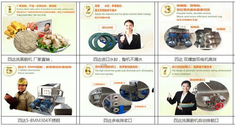 四達大型全自動洗面筋機,設備分為大、中、小和大型等規格。為洗面和面一體機,是圓桶型洗面機的取代產品。四達牌全自動洗面機從10袋面到 40袋面多種規格。雙動力驅動,雙絞龍推進器,雙向旋轉,比單絞龍和面洗面效率提高一倍,立體搓揉、擠壓,洗凈率超手工,比單絞龍洗面機和用鐵棍式和面機洗面更科學,箱體為凸底,比和面機式圓弧底尤其是立式和面機,存面少,耐用易清理,絞龍軸直徑加大,洗面機中絞龍直徑大的洗面機,洗面時間比傳統洗面機縮短20分鐘,節省能源和人工,進口水封,多道密封,確保耐用不漏水。外置過濾網,放水速度快,清理更方便。性能穩定,操作維護更簡單。四達牌全自動洗面機適合批發涼皮搟面皮,批發面筋和制作谷朊粉使用。