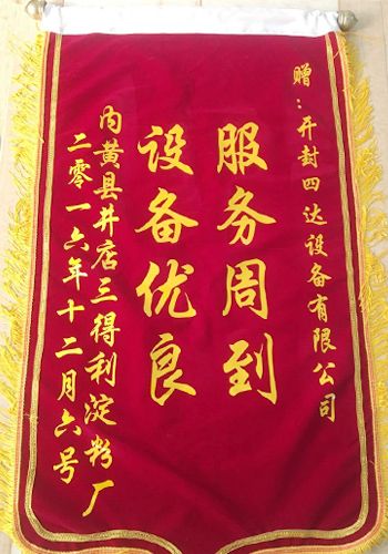 12月8日一早,開封四達(dá)辦公室收到了一面鮮紅錦旗,內(nèi)黃客戶感謝四達(dá)公司為其設(shè)計安裝了一套性價比超高的日產(chǎn)10噸小麥淀粉加工設(shè)備。